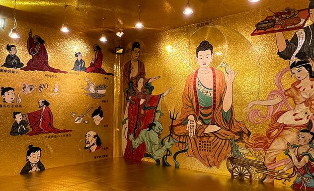 由手工一個一個黏上去建造而成的媽祖金殿,不只黏上去,還需要使用個體大小相同的馬賽克磁磚細心拼貼。